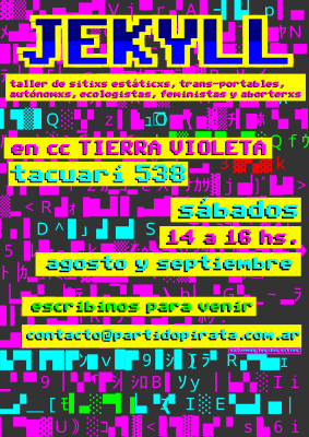 Todos los sábados de agosto y septiembre, de 14 a 16 horas, se realizará un taller de armado y alojamiento de páginas web en el Centro Cultural Feminista Tierra Violeta, en Tacuarí 538, Ciudad Autónoma de Buenos Aires. Las personas que participen podrán desarrollar un sitio web basado en el software libre Jekyll y otras herramientas de desarrollo cooperativo. Se trata de sitios web estáticos, seguros y sostenibles, ya que una vez publicados no dependen de servicios especiales para su funcionamiento. Les talleristas a cargo pertenecen a las Barcas Transfeminista y Utopías Piratas del Partido Interdimensional Pirata.